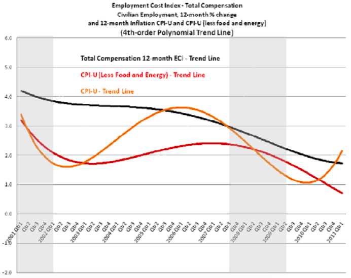 Federal monetary policy makers appear to expect this consistent growth in compensation costs to employers to hold (i.e. no rapid acceleration in pay and benefits). In his press conference two days before this quarter’s ECI release, Federal Reserve Chairman Ben Bernanke stated that “If households and firms continue to expect” current price increases to be temporary, “then increased commodity prices are unlikely to induce significant second-round effects in which inflation takes hold in non-commodity prices and in nominal wages.”2