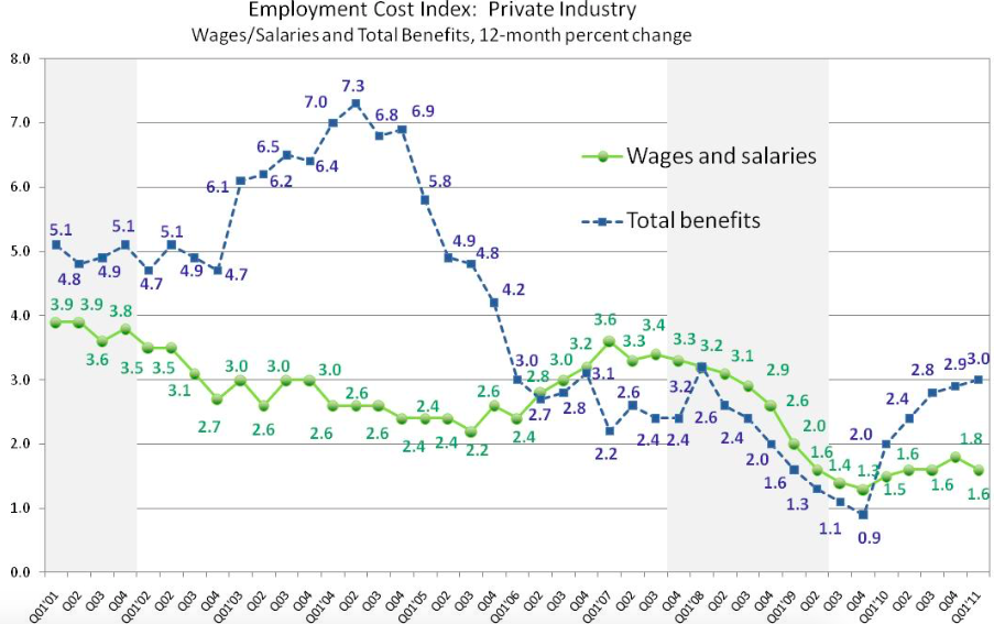 Over the 12 months ending March 2011, what employers (private and state and local governments) spent on employee benefits is up 3 percent—this is slightly higher again than the 2.9 percent more for the 12 months ending December 2010. Across all civilian workers, wages and salaries, on the other hand, increased just 1.6 percent from a year ago.