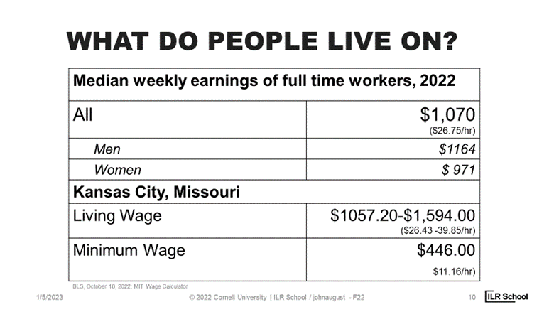 Note: the above slide uses Kansas City, MO as an example of the Living Wage as calculated by the MIT Wage Calculator which indicates what a Living Wage is in all parts of the country. The example of Columbia, SC above illustrates the national consistency which shows that in different parts of the country, half the population at least does not earn a Living Wage. A Living Wage is considered what is necessary to pay for food, child care, medical, housing, transportation, and other necessities. It does NOT include money for savings or vacation.